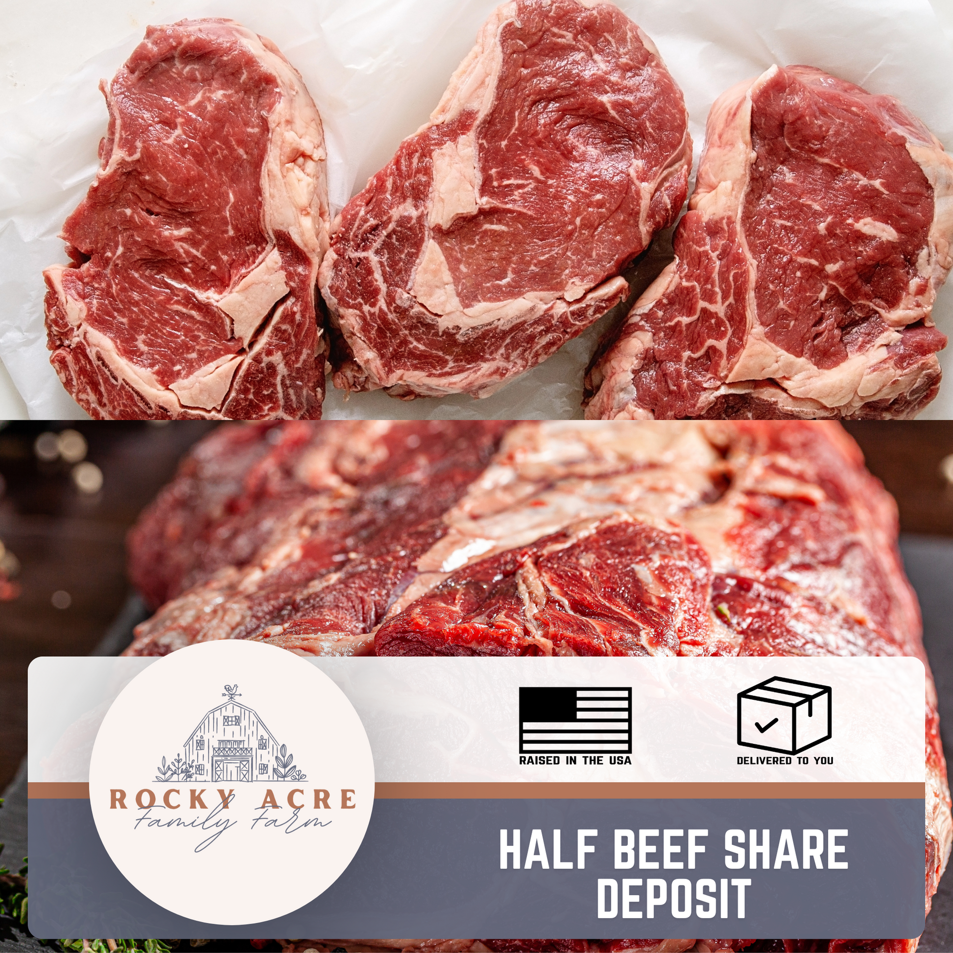 How it works: You reserve a Rocky Acre half beef share today with a $437 deposit. We reserve one of our premium angus steers for your family. Our USDA-certified butcher will process your beef and pack it in individual vacuum-sealed packages. Once your beef is ready, we will send you an invoice to collect the rest of the payment ($1312). Then we will ship it, or deliver it to your door.